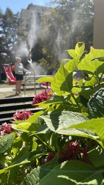 Mlžítko úspěšně prošlo zkušebním provozem, během kterého jsme předvedli všechny jeho funkce paní ředitelce a jejímu týmu. Bylo krásně vidět, jak se jemná vodní mlhovina šíří zahradou a vytváří příjemně osvěžující prostředí.